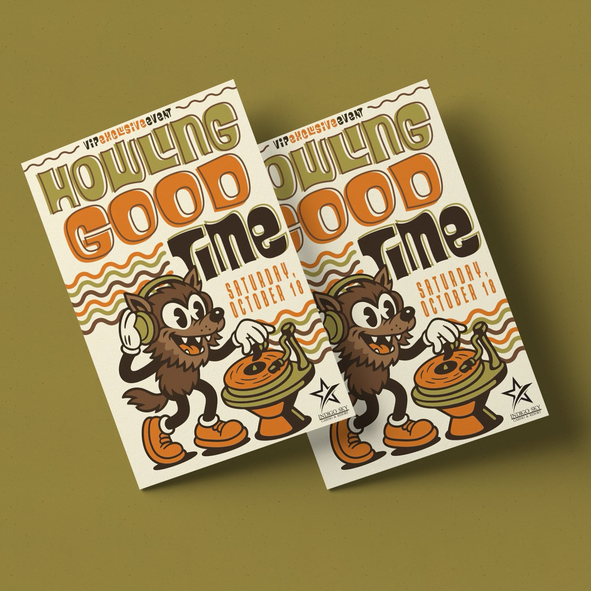 The design features bold retro-inspired typography, a playful cartoon werewolf DJ character, and a warm autumnal color palette of oranges, olives, and creams. The layout captures a nostalgic, 1970s aesthetic while keeping the energy fun and festive—perfectly aligning with the event's theme.